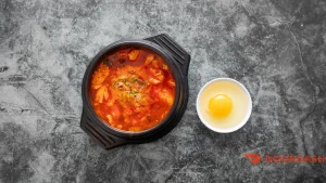 SPICY TOFU SOUP (Soup and Stew) Made with soft tofu, mixed seafood, onion, green onion, jalapeno, egg, etc